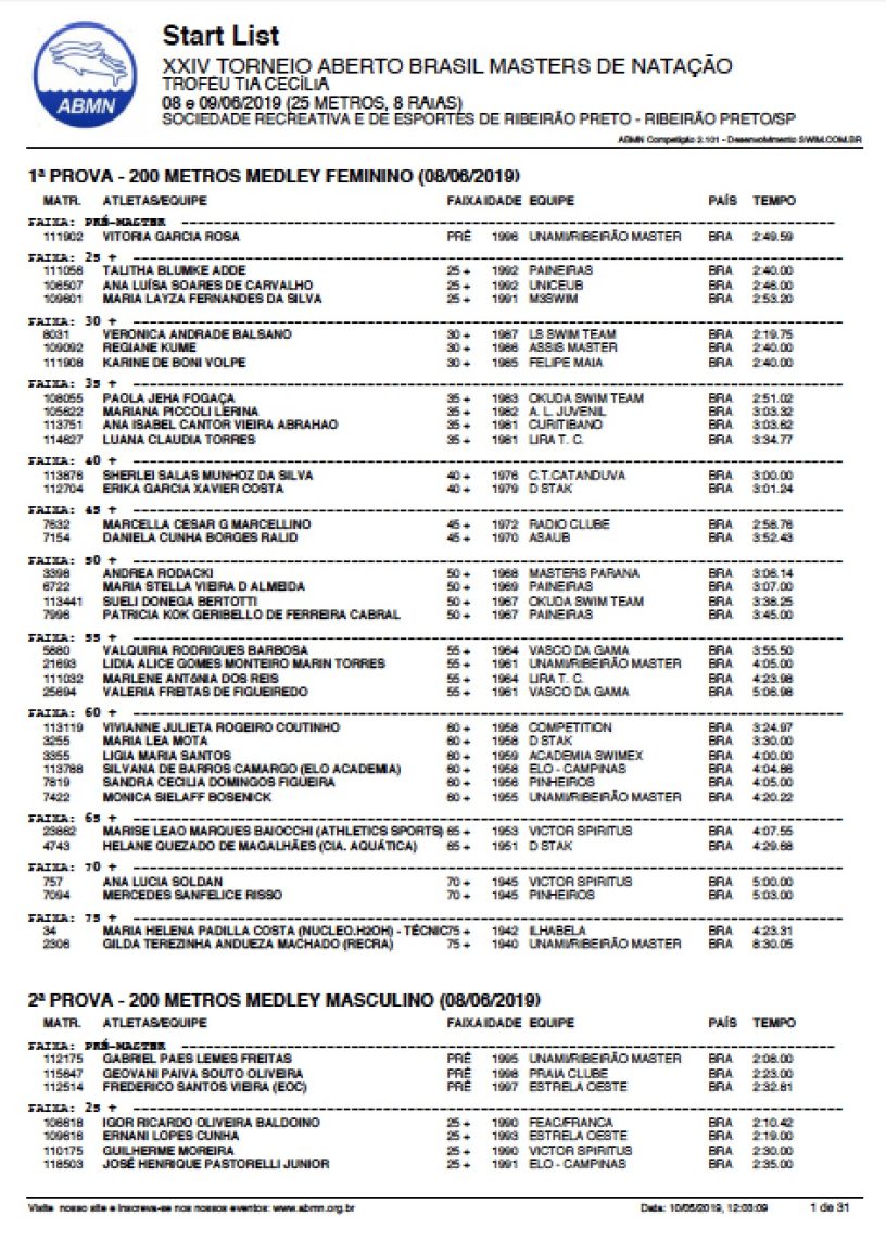 A ABMN divulgou hoje o start list do XXIV Torneio Aberto Brasil Masters de Natação – Troféu Tia Cecília, a ser realizado na Recra, em Ribeirão Preto/SP, dias 8 e 9 de junho: